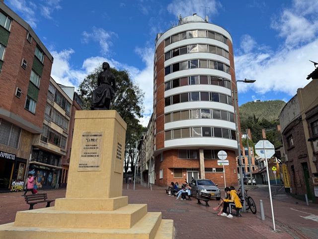 Subiendo por la avenida de Jiménez de Quesada o Carrera 3, nos encontramos con la estatua de Policarpa Salavarrieta, una heroína de la independencia de Colombia, la cual espió para las fuerzas independentistas criollas durante la Reconquista española.