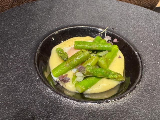 De la carta elegimos de primeros el Canelón (aunque me vinieron tres canelones pequeños en vez de uno grande) y Espárragos verdes con huevo y trufa .
